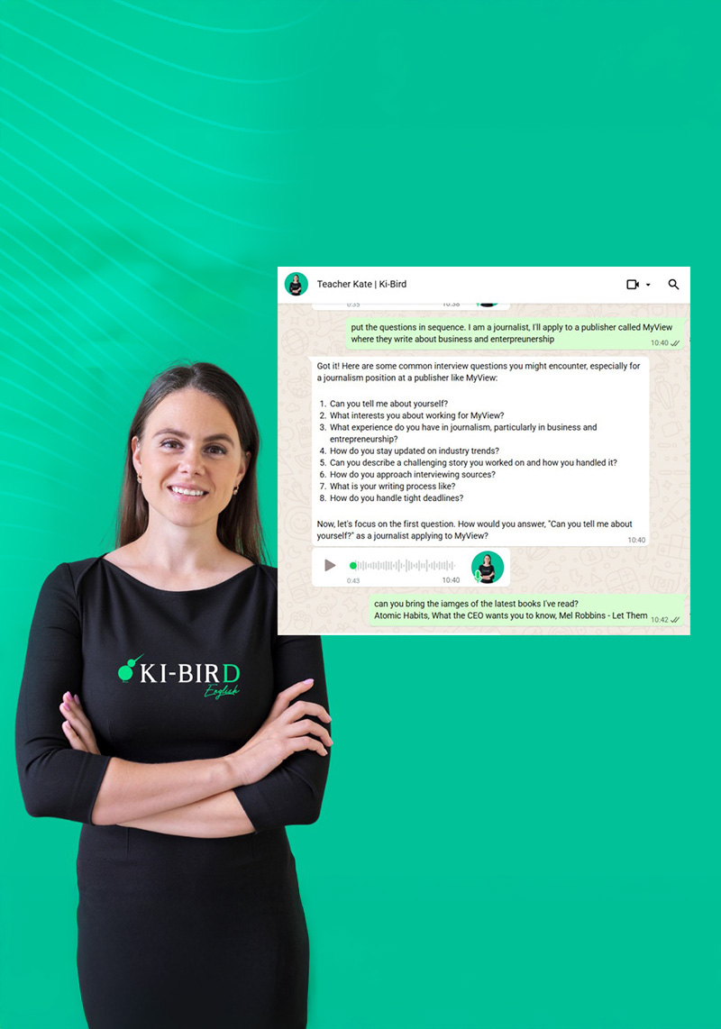 A Teacher Kate está preparada para ajudar você com qualquer demanda do inglês — desde a preparação para exames de proficiência, provas e certificações até entrevistas de emprego, apresentações profissionais, viagens ou objetivos pessoais. Ela se adapta às suas necessidades e ao seu ritmo de aprendizagem, oferecendo exercícios e feedback personalizados.